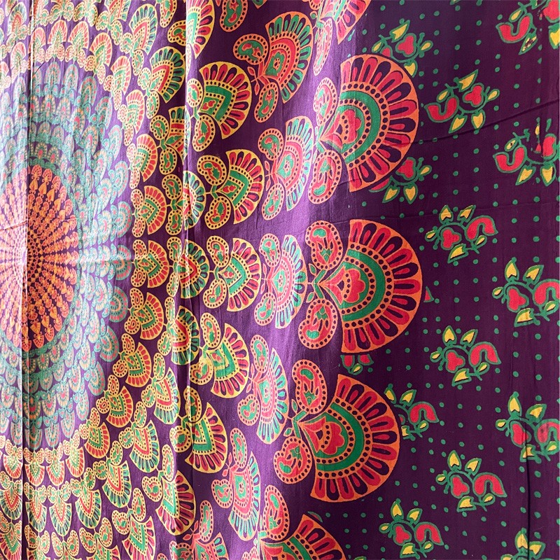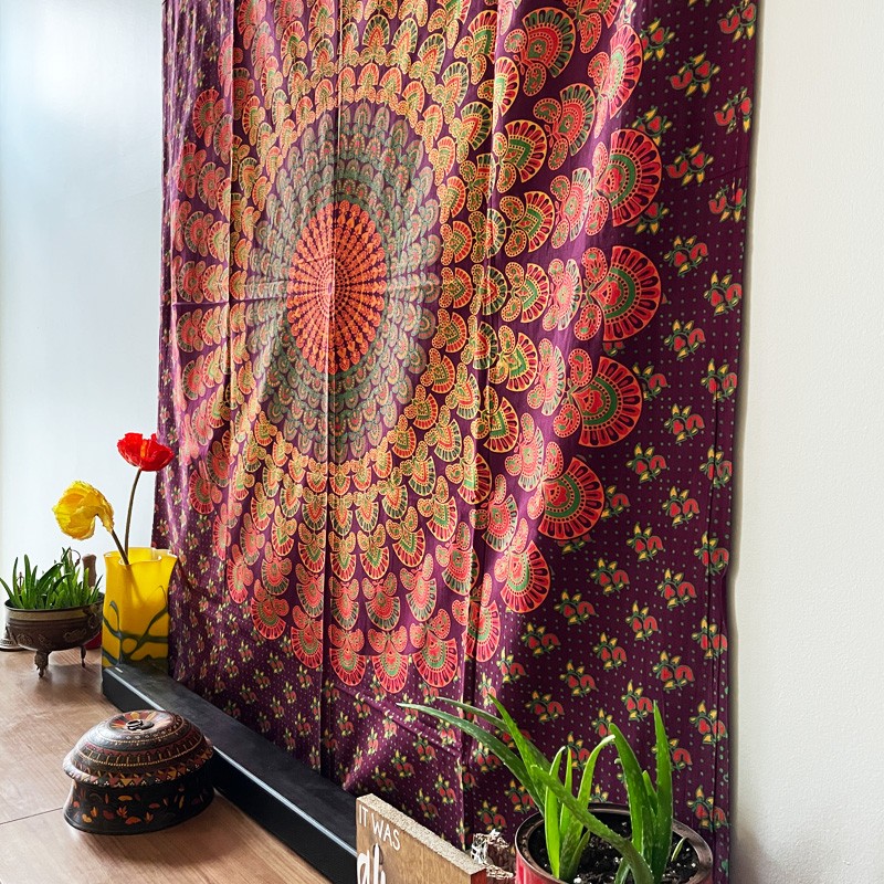This tapestry is made in India from 100% cotton and measures approximately: 60″x90″ (Twin Size).Disclaimer* Colors may vary from photo depending on lighting. Cleaning directions: Washable alone, by hand or machine wash alone (cold water, delicate cycle). Do not tumble dry and iron backwards at ‘’cotton’’ temperature.