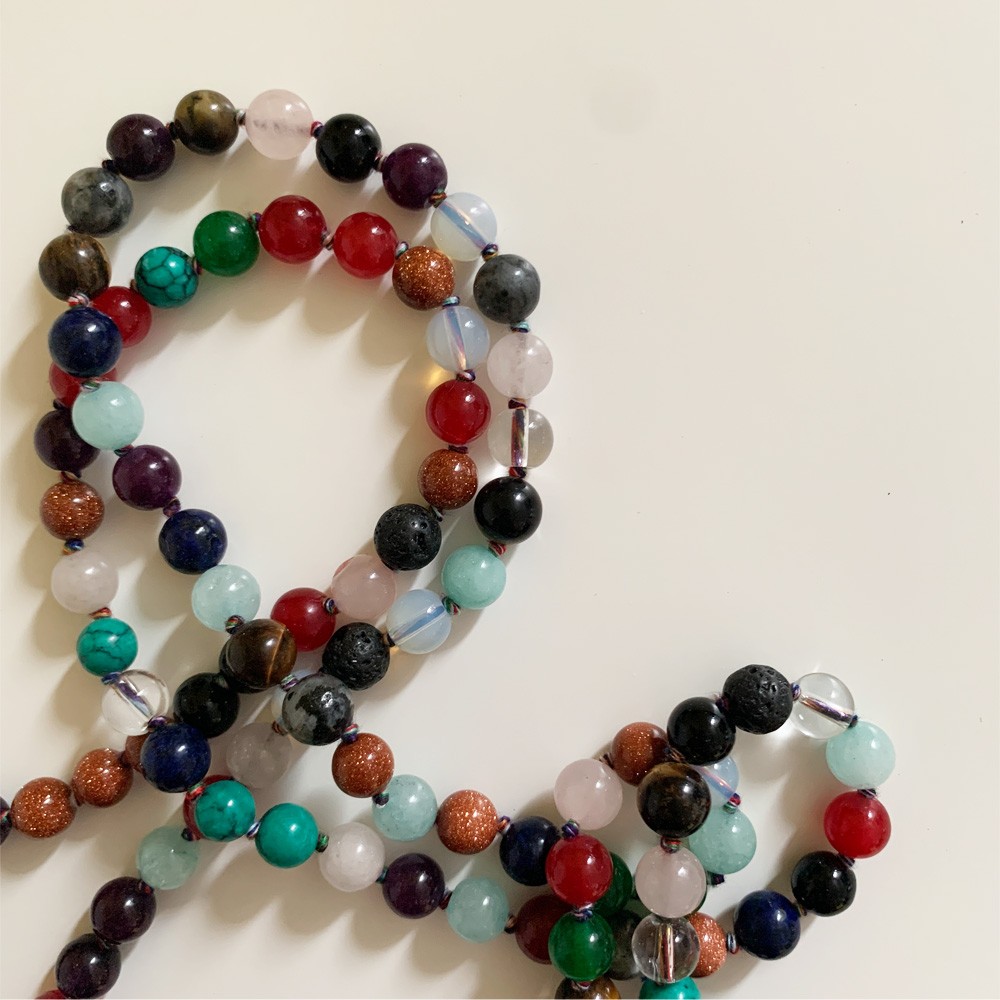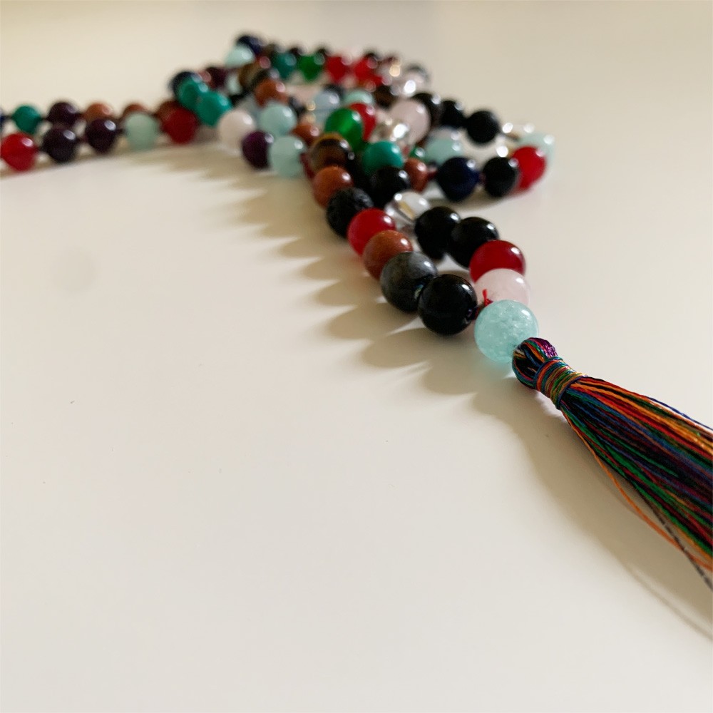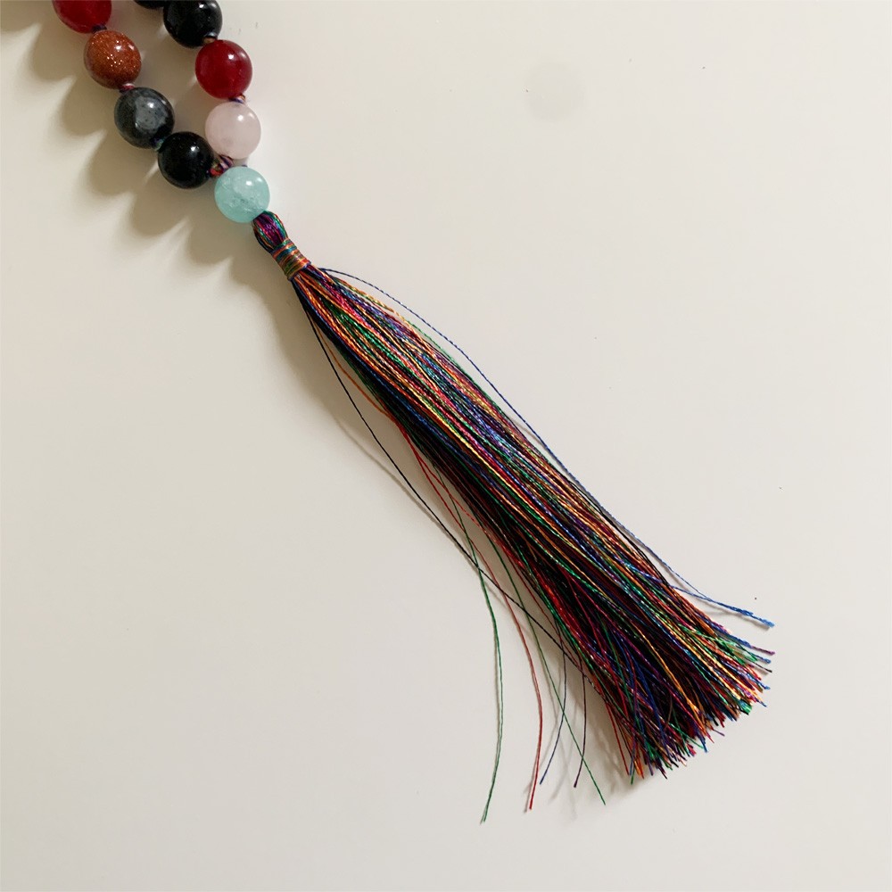 (Handmade = Dimensions may Vary slightly) Length between 19’’ and 25’’ + 4’’ Tassel + 8mm Beads. This Mala is made from an assortment of stones with complementary energies, each carefully selected to resonate with a particular Chakra’s energy (Root, Sacral, Solar Plexus, Heart, Throat, Third Eye, Crown).