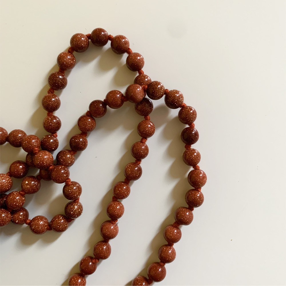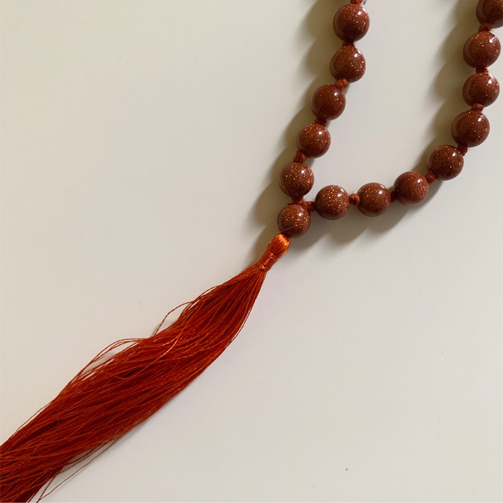 (Handmade = Dimensions may Vary slightly) Length between 19’’ and 25’’ + 4’’ Tassel + 8mm Beads. Fun fact: Red Goldstone is not a stone per say, it is in fact a type of glass! It is associated with the Sacral Chakra, making it a powerful ally to help us raise our energy levels, ambition, courage and to keep a positive attitude. Increases drive and confidence. A gently uplifting stone, Goldstone promotes vitality.