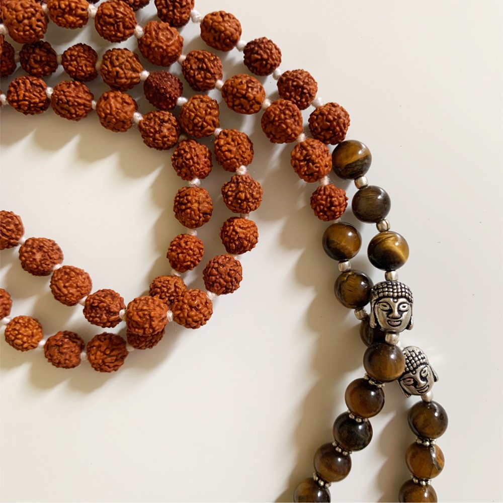 Rudraksha Buddha Mala with Stones – Tiger’s Eye