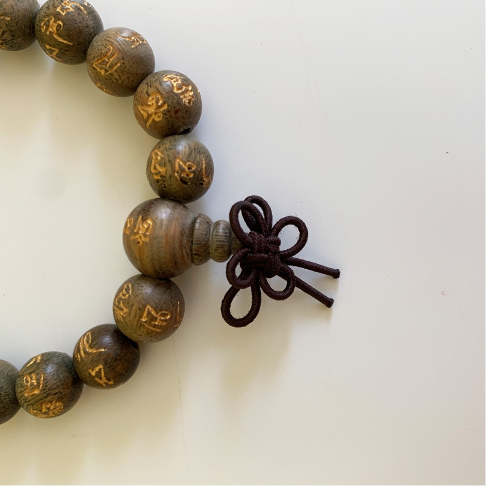 Handmade in India. Painted wood Mala bracelet with mantra pattern. Length 3.5”, 8mm Beads.