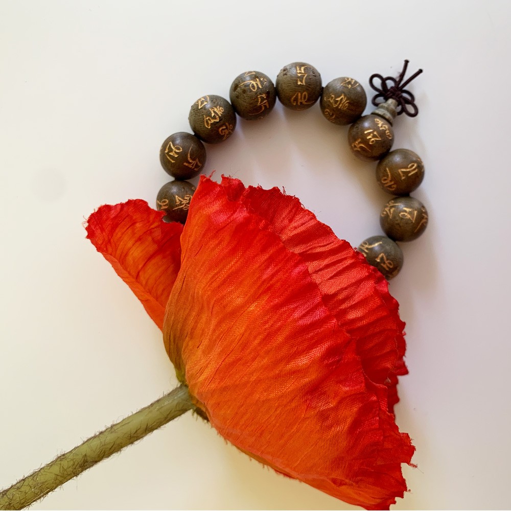 Handmade in India. Painted wood Mala bracelet with Mantra pattern. Length 4”, 15mm Beads.