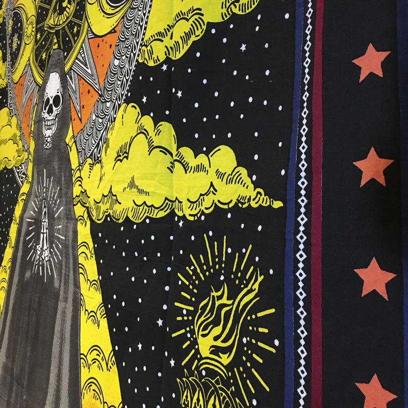 This tapestry is made in India from 100% cotton and measures approximately: 60″x90″ (Twin Size).Disclaimer* Colors may vary from photo depending on lighting.Cleaning directions: Washable alone, by hand or machine wash alone (cold water, delicate cycle). Do not tumble dry and iron backwards at ‘’cotton’’ temperature.