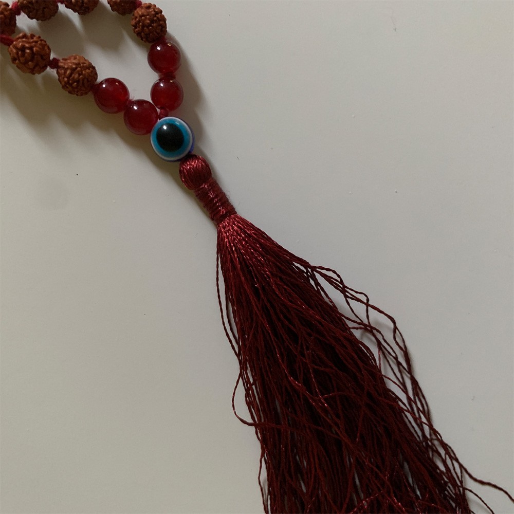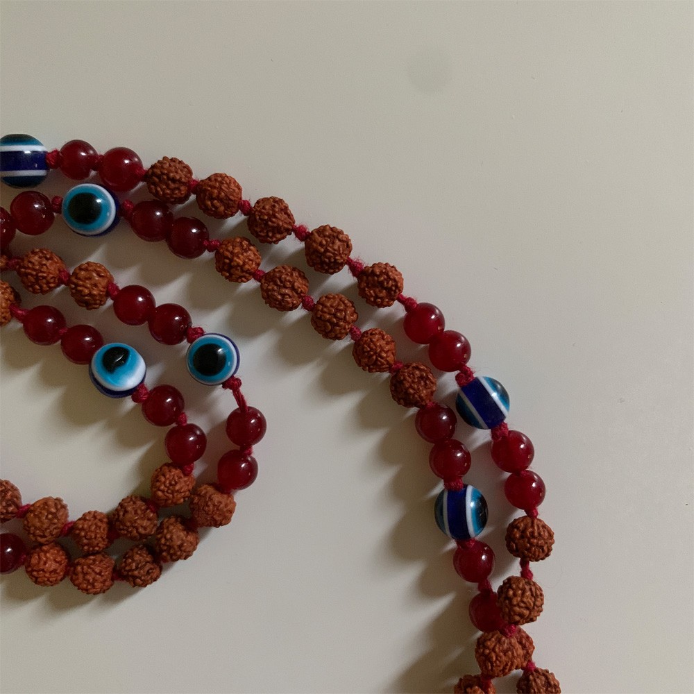 Turkish Eye Rudraksha Mala – Deep Red Chalcedony